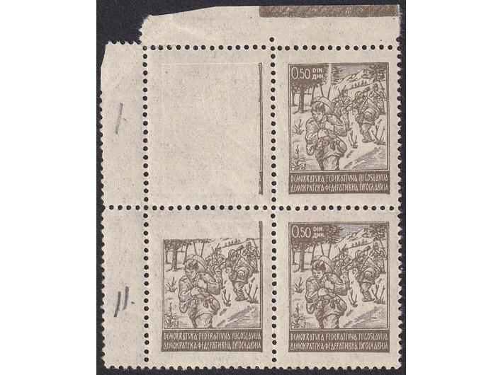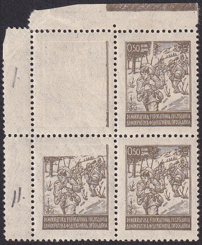Opis: Michel br. 470 četverac kod kojeg prva i dio treće marke nisu otisnuti zbog stranog tijela u tiskarskom stroju. Ex Vilfan.