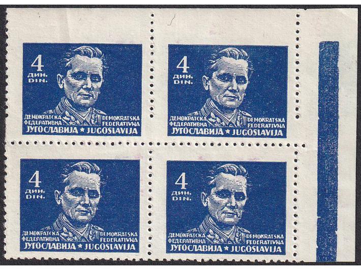 - Michel br. 477 Uo, četverac u odličnoj kvaliteti, gore nezupčan.