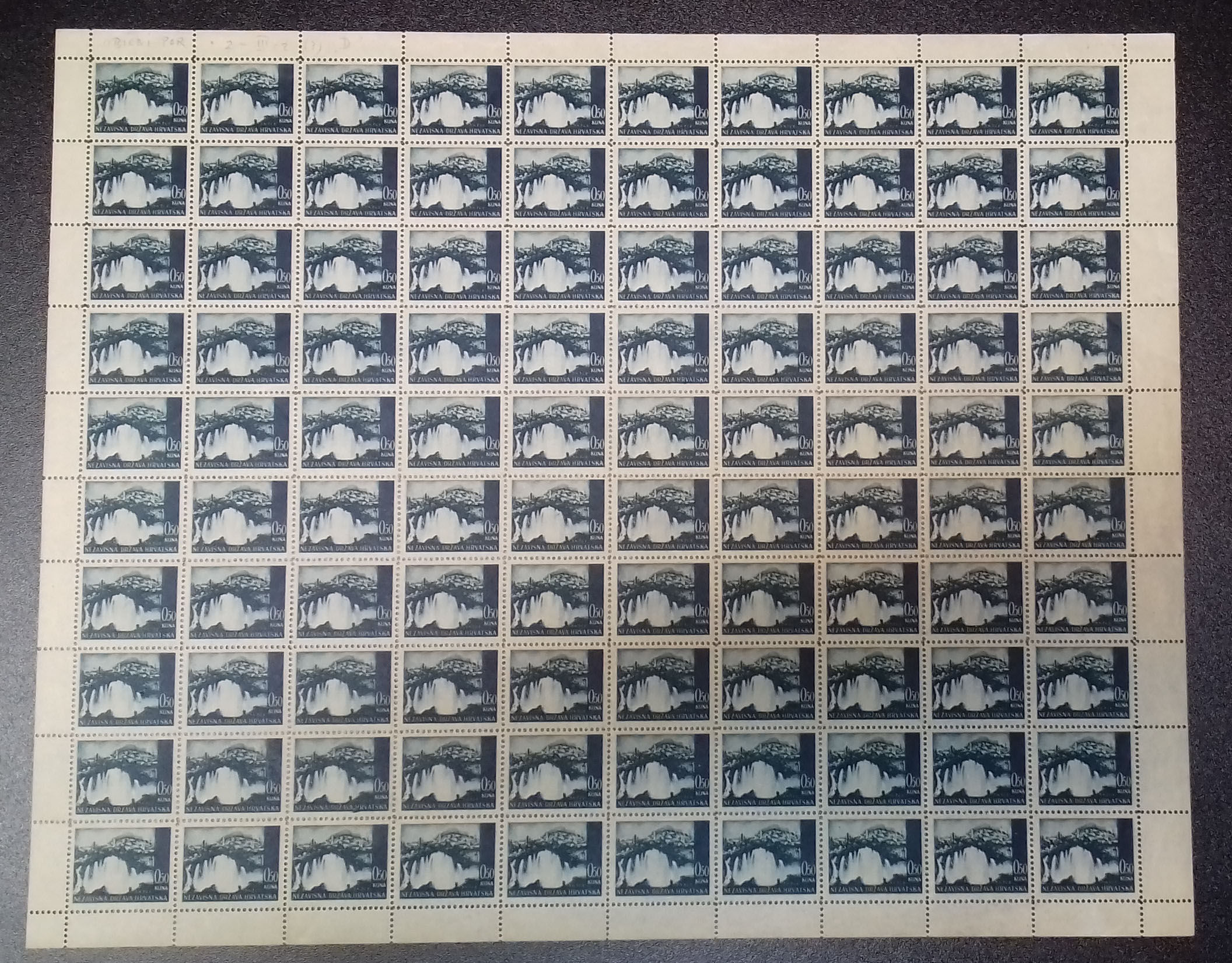 Opis: Michel br. 48 kompletan arak otisnut na poroznom papiru. Drugi šalterski arak. Dobra kvaliteta.