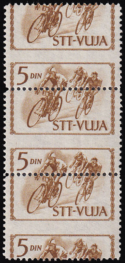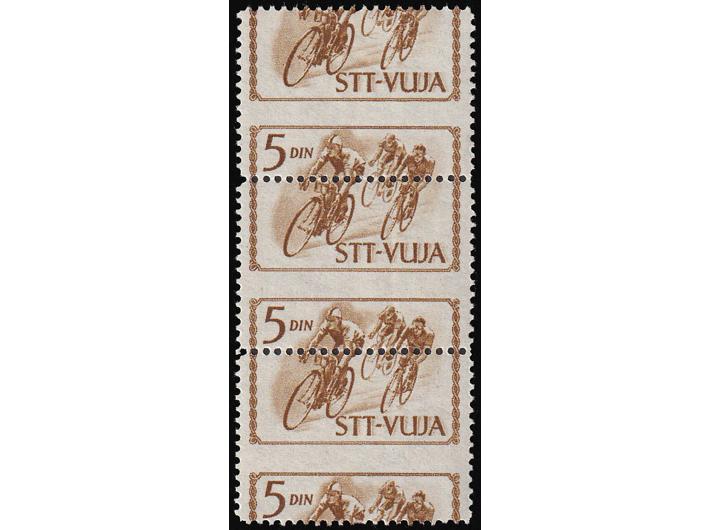 Opis: Michel br. 60 okomiti trojac s atraktivnim pomakom zupčanja. Opisano u Sassone pod 46(b). Gornja marka blagi falc.