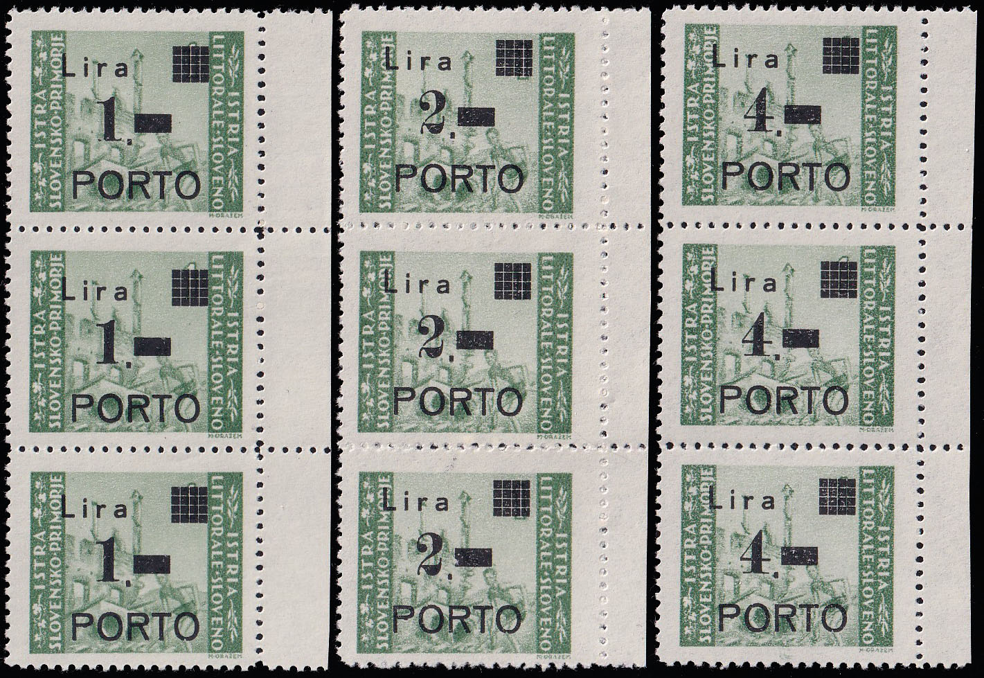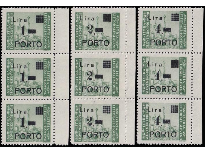 Opis: Michel br. 8/10 okomiti trojci pozicije u arku 60, 70 i 80. Sve tip pretiska Ia prema PS. Porto usko P. Ova kombinacija je moguća jednom u arku i vrlo je rijetka. Odlična kvaliteta.