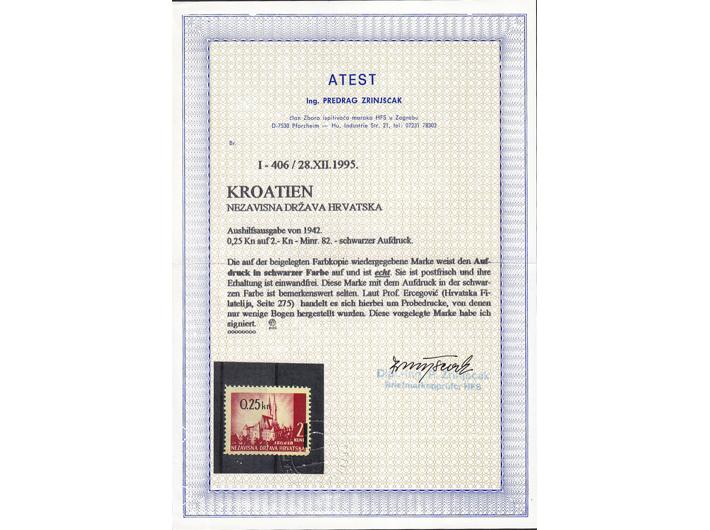 Opis: Michel br. 82 s probnim, crnim pretiskom. Opisano u BP pod 82 PO-V. Fotoatest Zrinjšćak, odlična kvaliteta.