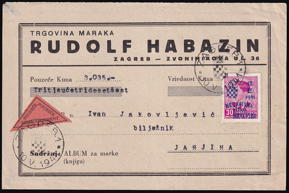 Opis: Naljepnica s paketa upućenog iz Zagreba u Janjinu 10.05. 1941. Sadržaj, album za marke tvrtke Habazin i otkupnina 3.036 kn. Frankirano markom 30 din. iz Jubilarnog niza i poništeno prigodnim žigom. Na poleđini punca Veličković. Dobra kvaliteta, bez garancije.