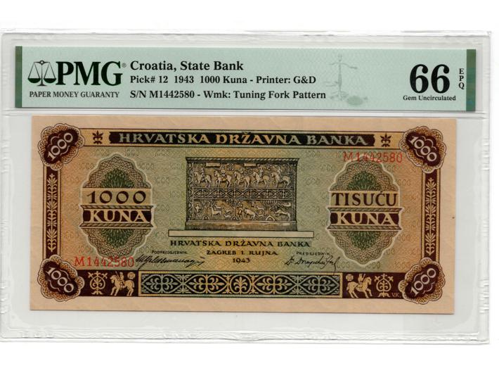 • NDH, 1000 kuna 1.rujna 1943 - OBRNUTI VODOZNAK, rijetko - UNC 66 - gradirano u plastici PMG66