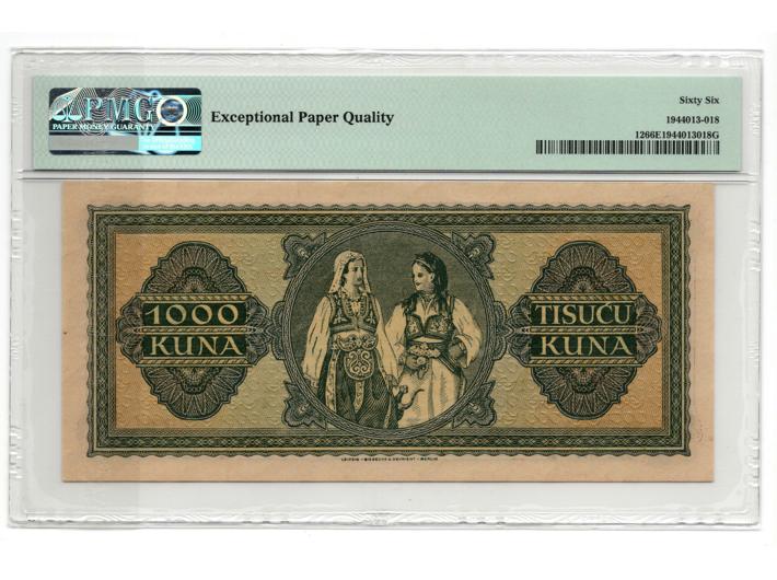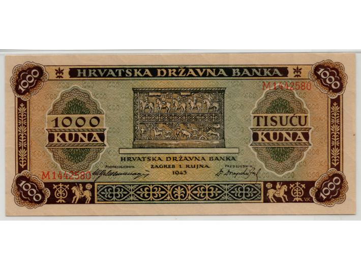 Opis: NDH, 1000 kuna 1.rujna 1943 - OBRNUTI VODOZNAK, rijetko - UNC 66 - gradirano u plastici PMG66