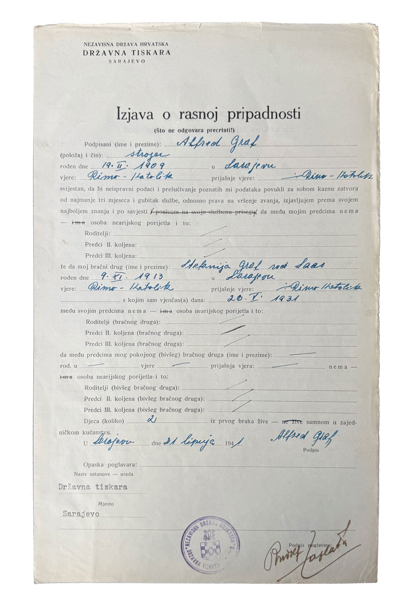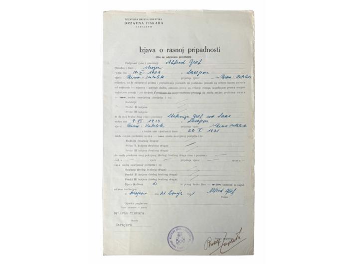 • NDH, izjava o rasnoj pripadnosti, sa žigom Državne tiskare Sarajevo, 1941.
