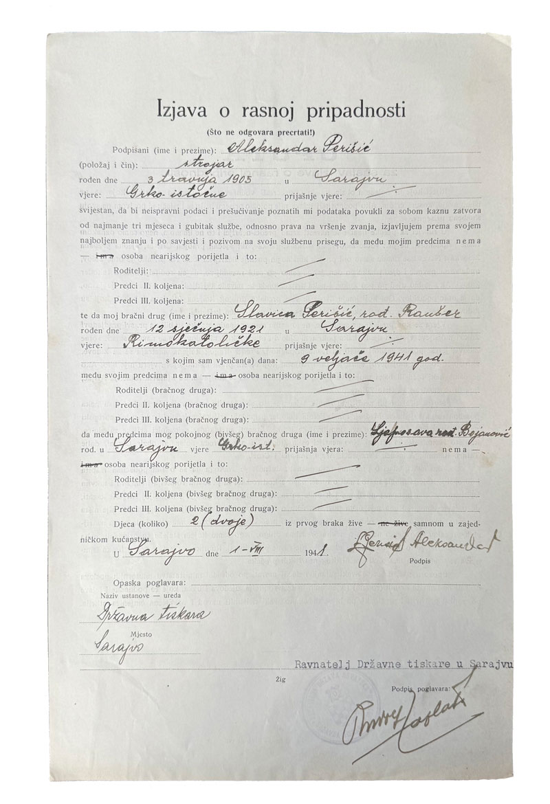 • NDH, izjava o rasnoj pripadnosti, sa žigom Državne tiskare Sarajevo, 1941.