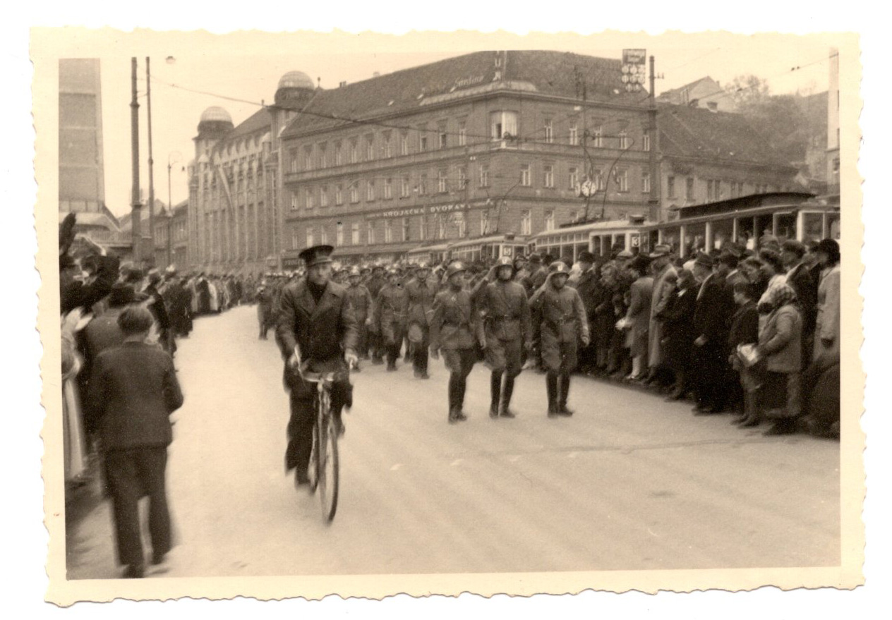• NDH, postrojavanje u ratnim odorama (kacige s velikim U) na Trgu bana Jelačića, 100x68 mm