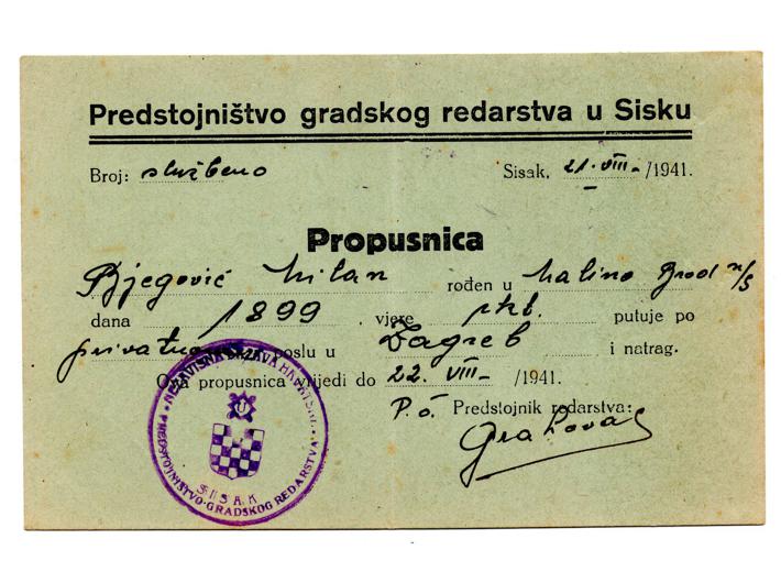 Opis: NDH, propusnica, SISAK, 1941, 155x99 mm, rijetko