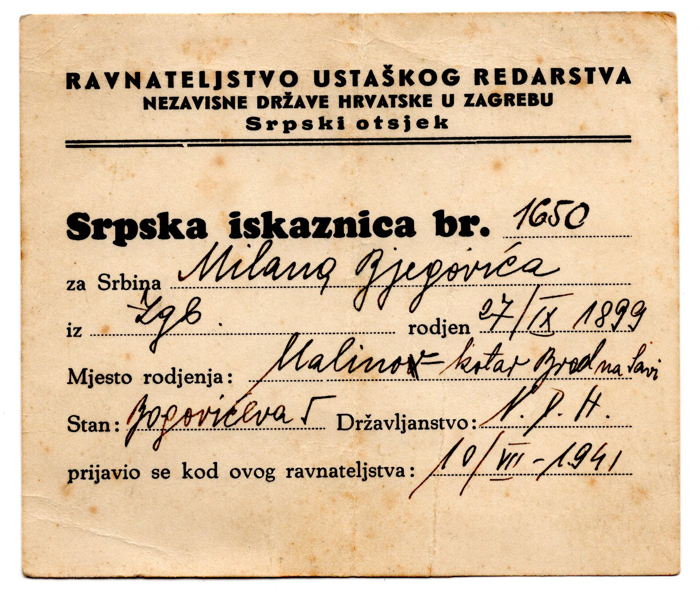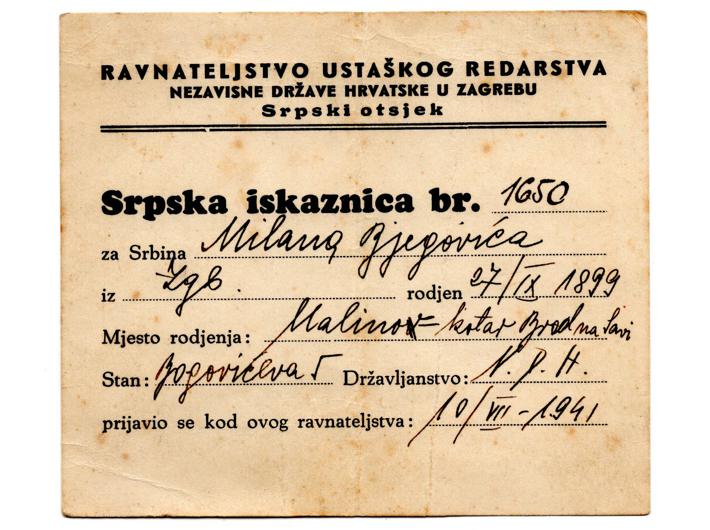 NDH, SRPSKA ISKAZNICA br. 1650 za Srbina Milana Bjegovića, 1941, izuzetno rijetko