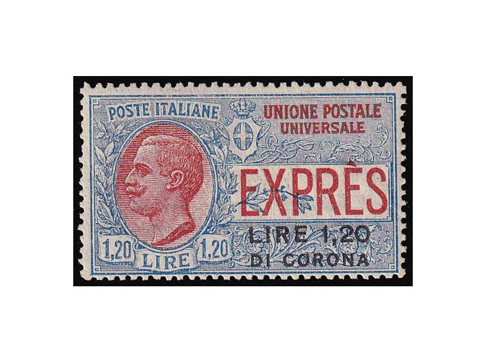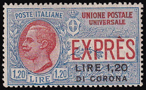 - Neizdana marka s pretiskom 1,20 Lire di corona u odličnom stanju.