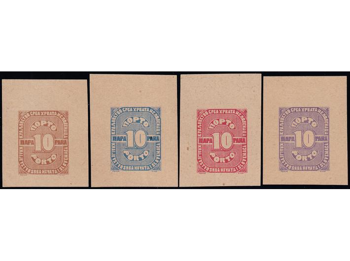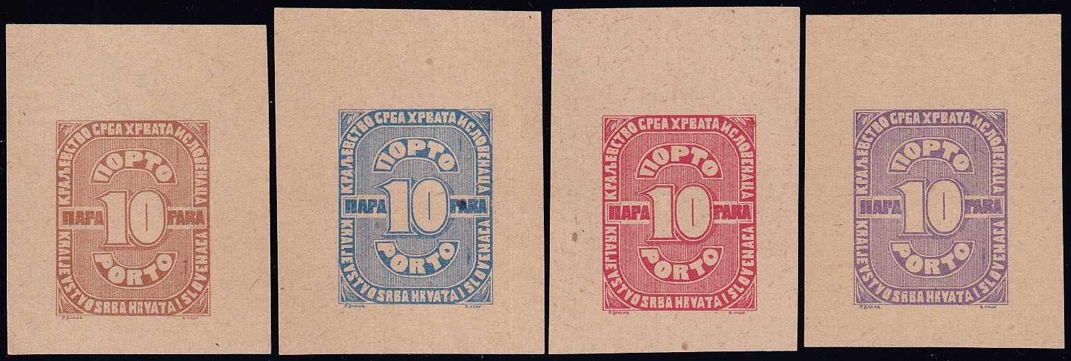Opis: Neprihvaćeni prijedlozi za porto marke nominale 10 para u 4 boje. Odlična kvaliteta, rijetko.