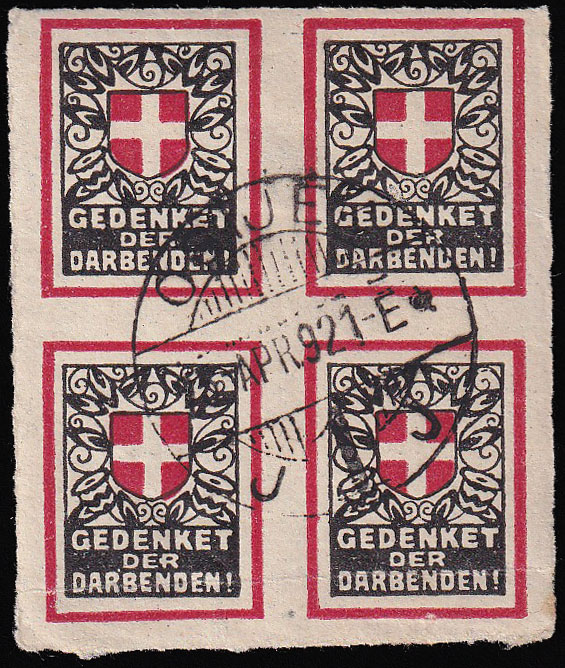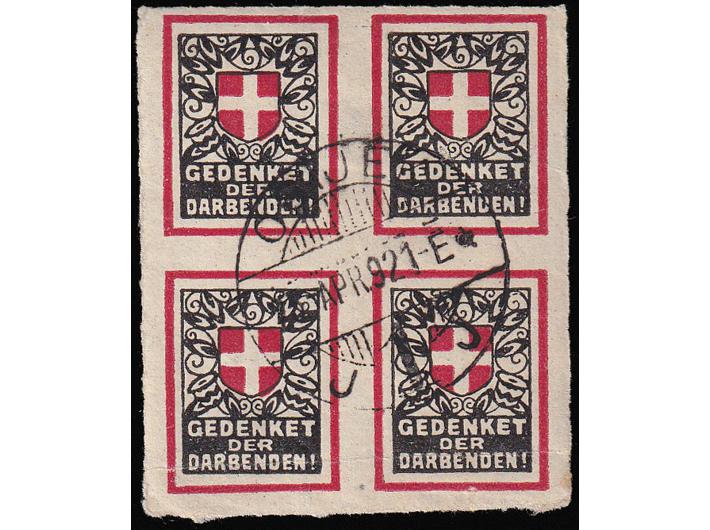 - Nezupčani četverac vinjeta Gedenket der Darbenden (Sjeti se siromaha) sa žigom Osijeka 25.04. 1921.