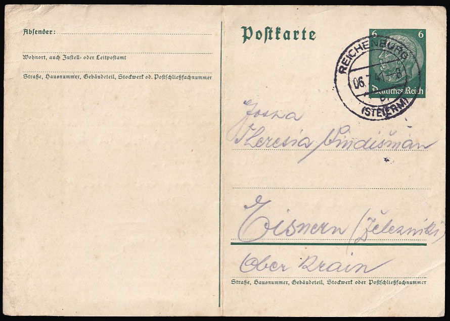 Njemačka dopisnica upućena iz REICHENBURGA (Brestanica) 06.07. 1941.