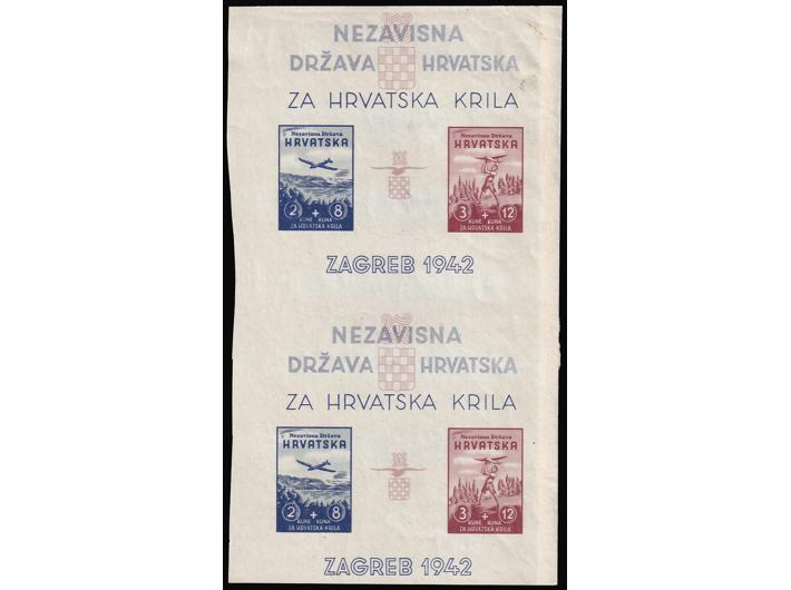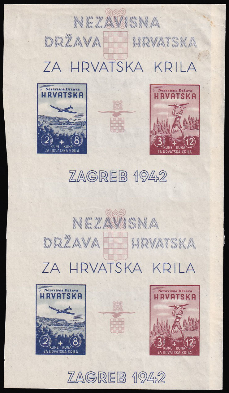 Opis: Okomiti nezupčani par blokova Za Hrvatska krila, nominale 2+8 i 3+12kn. Potječe iz ministarskog albuma. Dobra kvaliteta, atraktivno i rijetko.