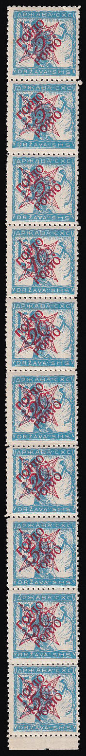 • Okomiti niz porto provizornih maraka sa svim pretisnutim vrijednostima.5, 10, 20 i 50 para.