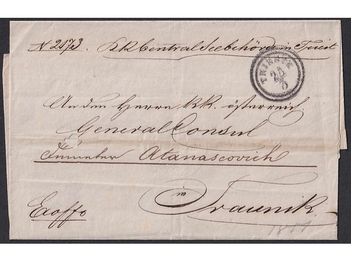 Opis: Omot pisma upućenog iz Trsta 23.03. 1851. preko Karlovca 27.03. Nove Gradiške 29.03. i Broda 30.03. u Travnik. Primatelj je generalni konzul Austrije u Bosni i Hercegovini. Dobra kvaliteta.