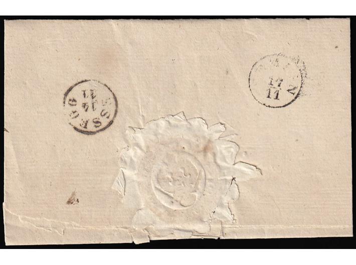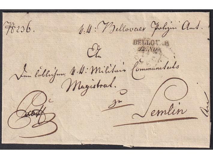 - Omot službenog pismo upućenog iz BELLOVAR (Bjelovar) u SEMLIN (Zemun) preko ESSEGG-a (Osijeka) 12.11. 1854.