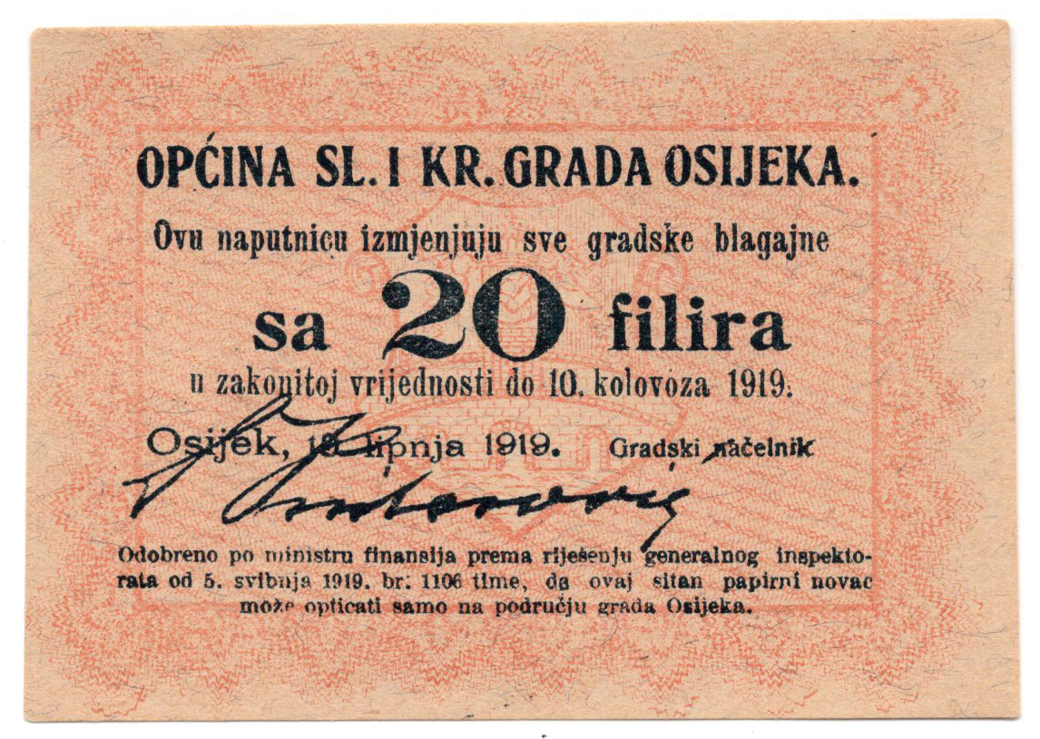 - OSIJEK, 20 filira, lipanj 1919. UNC