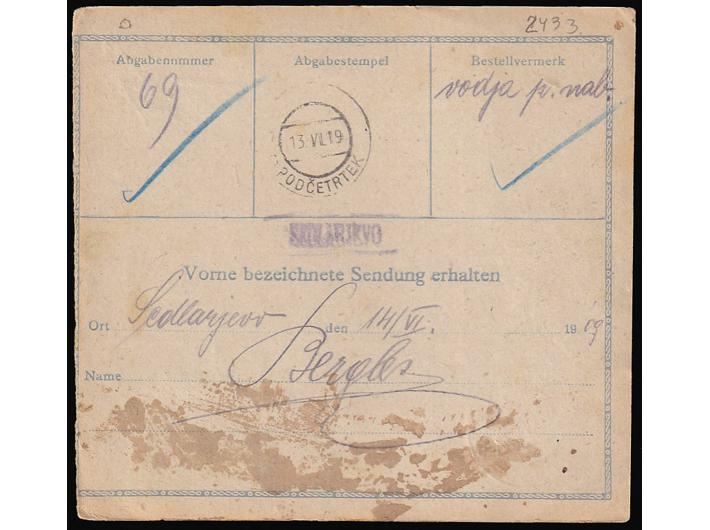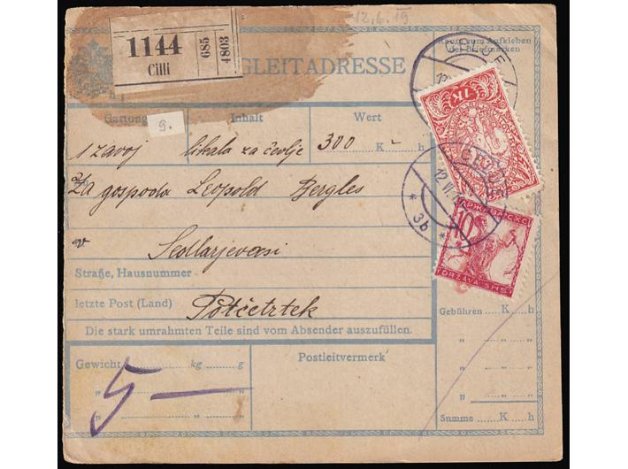 - Paketna karta za paket upućen iz Celja u Sedlarjevo kod Podčetrtka 12.07. 1919.