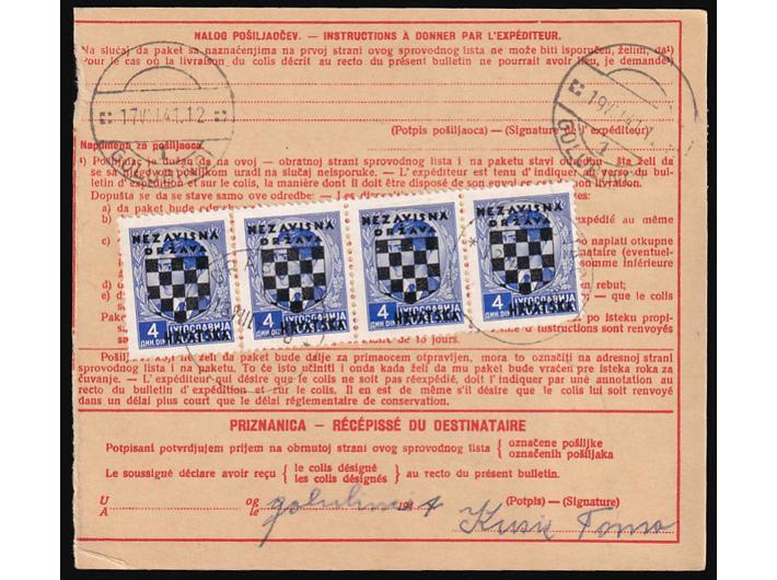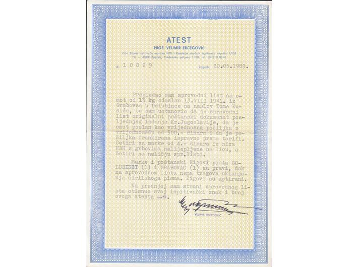 Opis: Paketna karta za paket upućen iz Grabovca u Golubince 13.08. 1941. Točna frankatura markama 4 din. iz izdanja Grbače. Atest Ercegović. Odlična kvaliteta.