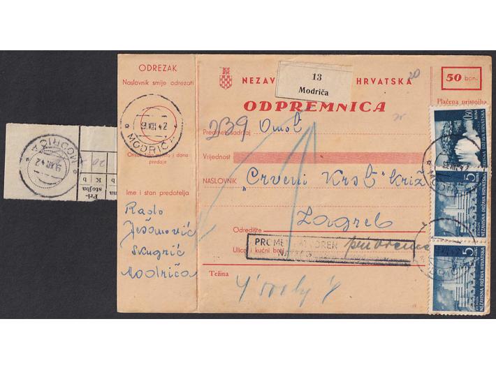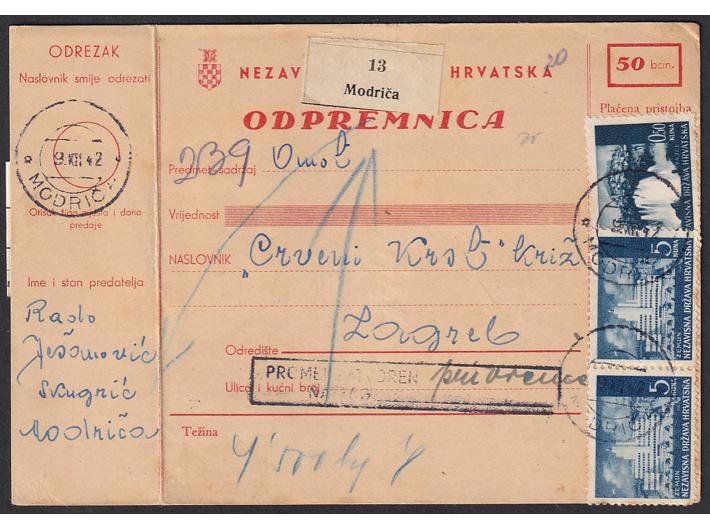 - Paketna karta za paket upućen iz Modriće u Zagreb 09.12. 1942.