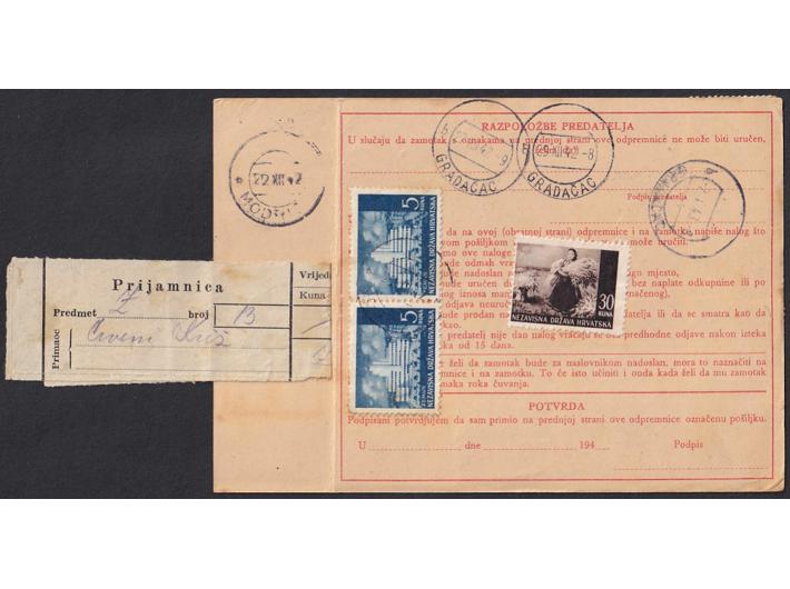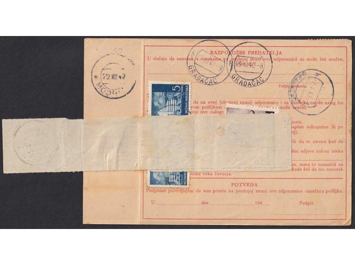 Opis: Paketna karta za paket upućen iz Modriće u Zagreb 09.12. 1942. Zbog ratnih operacija poštanski promet zatvoren. Pravokutni žig PROMET ZATVOREN privremeno (upisano rukom) NATRAG. Na poleđini žigovi Modriče od 22. 12. i Gradačca 25., 27. i 29.12. 1942. Dobra kvaliteta.