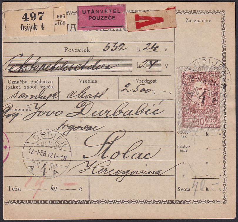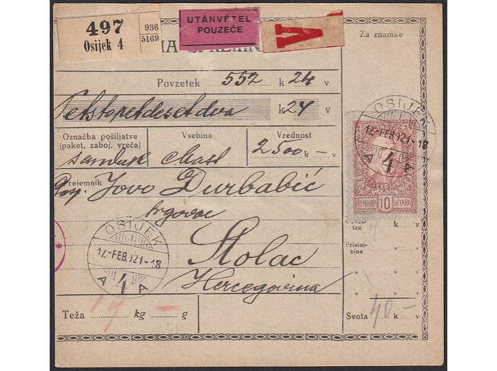 Opis: Paketna karta za paket upućen iz Osijeka u Stolac 17.02. 1921. Rijetka frankatura 10 din. Dolaz na poleđini.