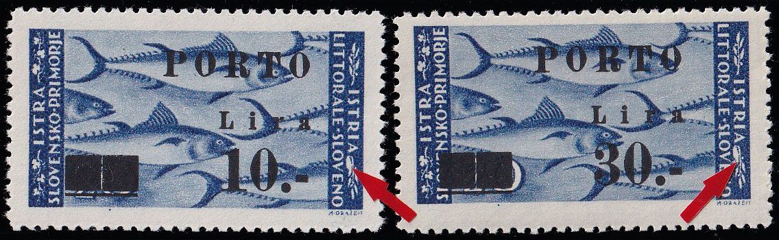• Peto porto izdanje pretisak 10/20 i 30/20 lira. Pogreška tiska 24 polja, široki list na ornamentu