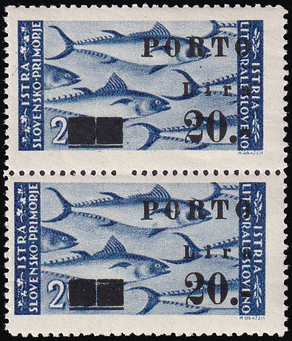 - Peto porto izdanje pretisak 20/20 lira okomiti par od kojeg je gornja marka sa slikom manjeg formata.