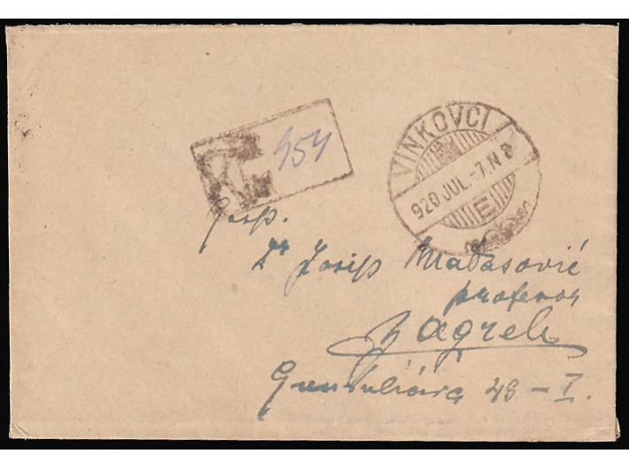 • Pismo malog formata upućeno iz Vinkovaca u Zagreb 07.07. 1920.