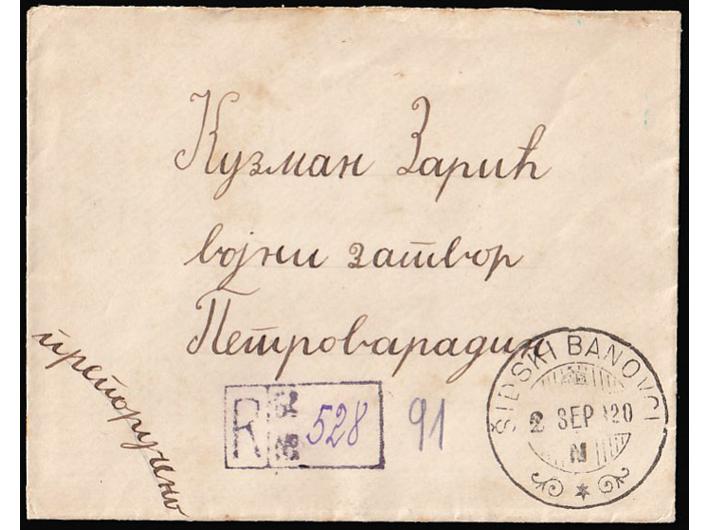 - Pismo manjeg formata preporučeno upućeno iz Šidskih Banovaca u vojni zatvor u Petrovaradinu 02.09. 1920.