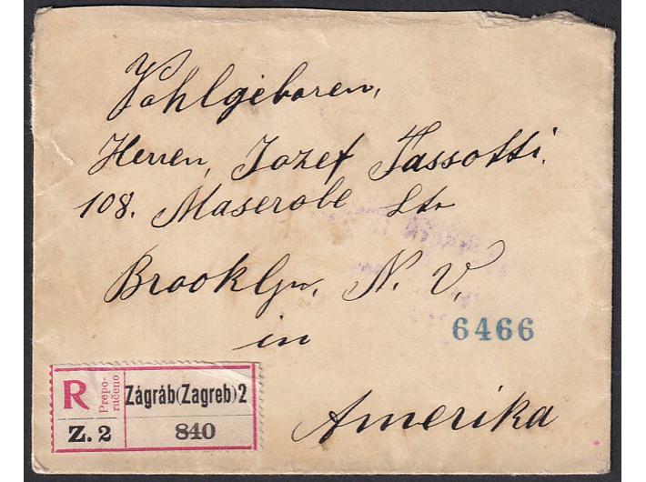 Pismo manjeg formata preporučeno upućeno iz Zagreba u New York 04.11. 1903.