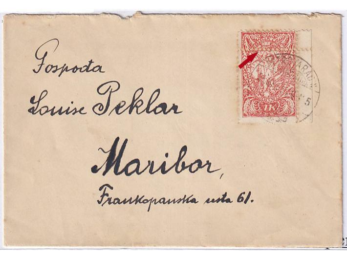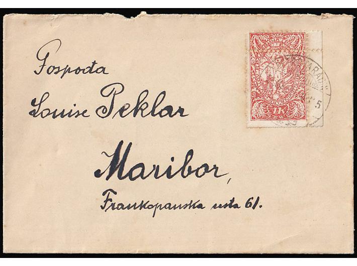 Opis: Pismo manjeg formata upućeno iz Petrovaradina u Maribor 23.? 1920. Frankirano markom 1 kruna dvostruko zupčana vodoravno u gornjem dijelu. Žute mrlje oko ruba marke.