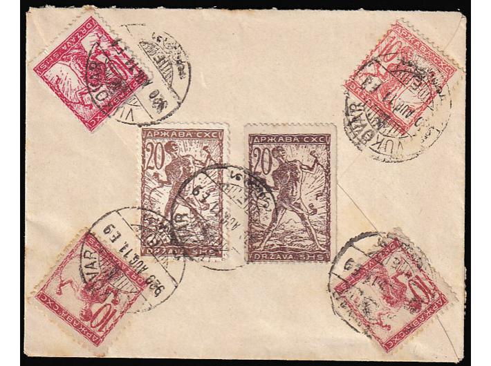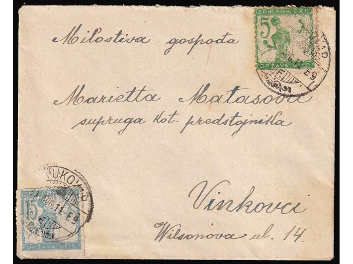 Opis: Pismo manjeg formata upućeno iz Vukovara u Vinkovce 11.08. 1920. Atraktivno obostrano frankirano. Dobra kvaliteta.