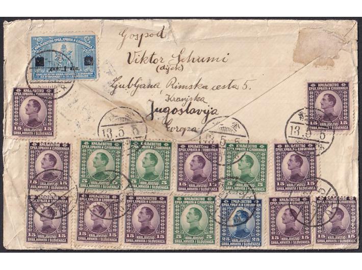 Opis: Pismo masovno franirano i upućeno iz Ljubljene u Kinse (Korea) 14.03. 1924. Marke na prednjoj strani koverte poništene u odlasku dok je frankatura na poleđini poništena u Japanu prilikom tranzita za Kinse. Zanimljiva destinacija.