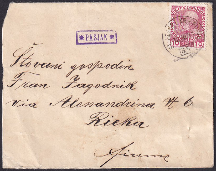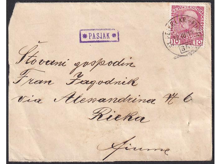- Pismo predano u poštanskoj agenciji PASJAK o upućeno prugom SV. PETER KR-FIUME 350 u Rijeku 12.3 1911.