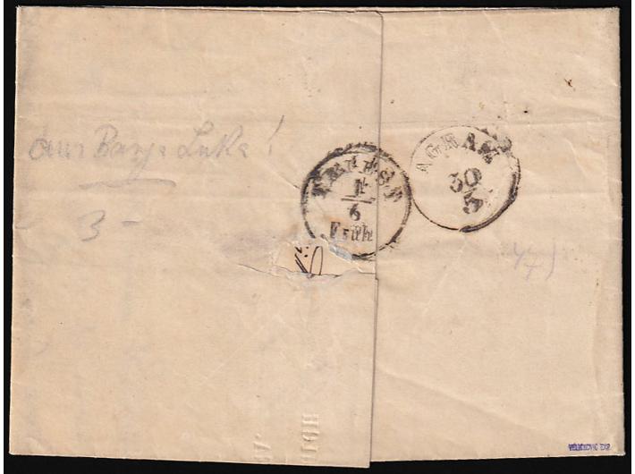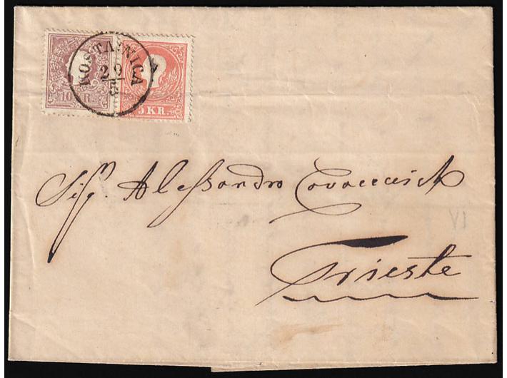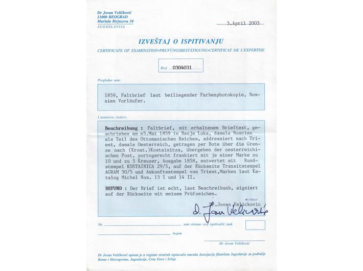 Opis: Pismo s kompletnim sadržajem pisano 05.05 1859. u Banja Luci u Bosni, tada dijelu Otomanskog carstva i upućeno u Trst, tada dijelu Austrijskog carstva. Prevezeno brodom do granice tj. mjesta (Hrvatska) Kostajnica gdje je točno frankirano s markam od 10 kr. (Michel br. 14 II) i 5 kr. (Michel br. 13 I). Poništene žigom pošte KOSTAINICA 29/5. Tranzit Agram (Zagreb) i dolaz Trst na poleđini. Zanimljiva i rijetka destinacija i kombinacija frankature dvaju tipova maraka. Dobra kvaliteta. Fotoatest Veličković BPP.