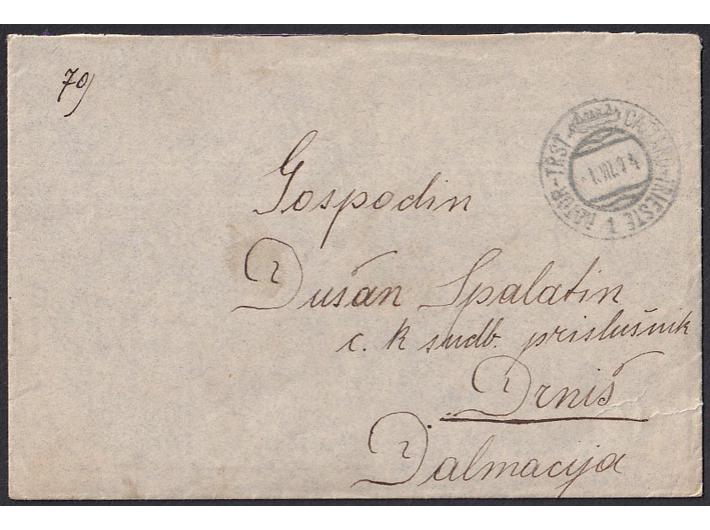 - Pismo s kompletnim sadržajem pisano u Kotoru i upućeno u Drniš brodskom prugom KOTOR-TRST 01.07. 1914.
