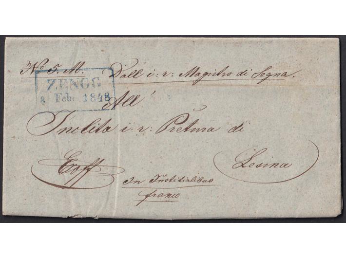 - Pismo s kompletnim sadržajm upućeno iz ZENGG (Senj) u LESINA (Hvar) 08.02. 1848.