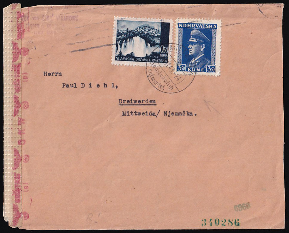 Opis: Pismo točno frankirano i upućeno iz Zagreba u Njemačku. Zbog lošeg žigosanja strojnim žigom u Zagrebu, prilikom dolaska žigosano žigom MITTWEIDA Nachträglich / entvertet 24.11. 1943. (Naknadno poništeno.) Cenzurirano po OKW cenzuri.
