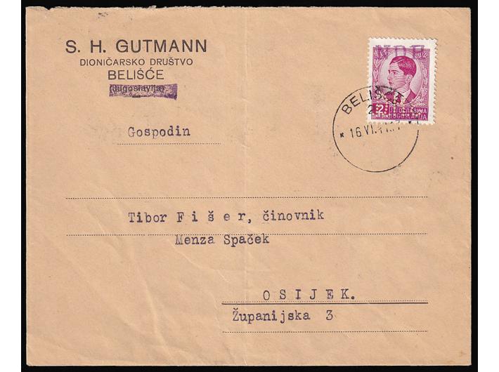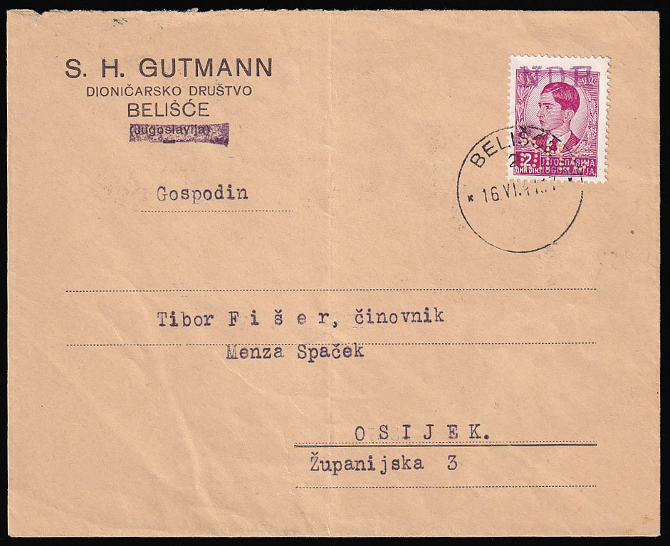 - Pismo upućeno iz Belišća u Osijek 16.06. 1941.