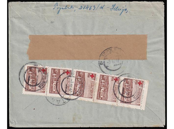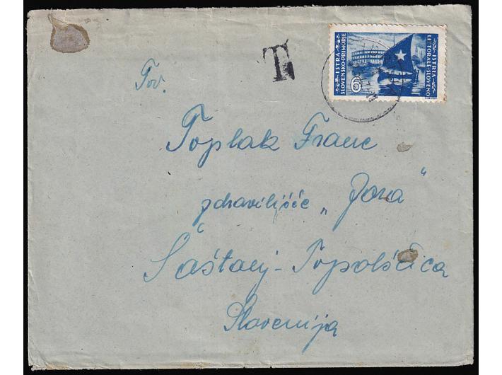 Opis: Pismo upućeno iz Idrije u Šostanj-Topolščica. Nedovoljno frankirano te u dolazu 03.04. u Topolščici portirano na poleđini. Zadnja marka okomitog niza oštećena. Vidljiv i tranzitni žig Šoštanj.