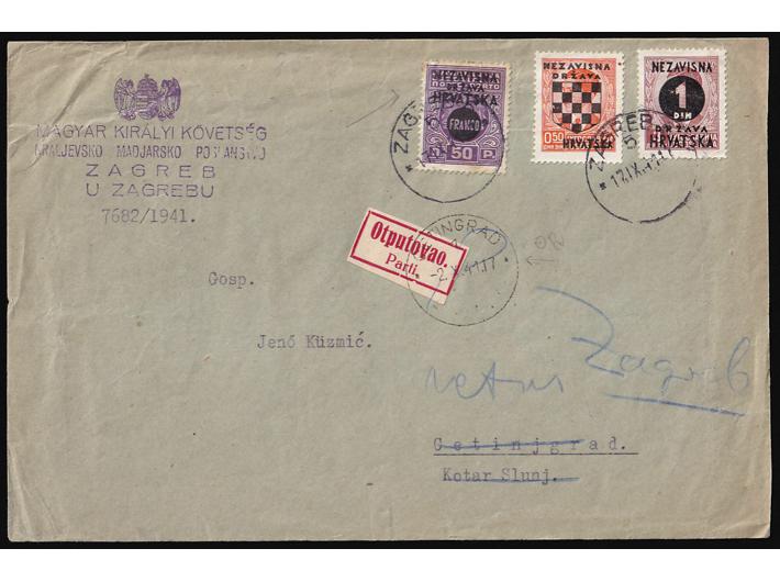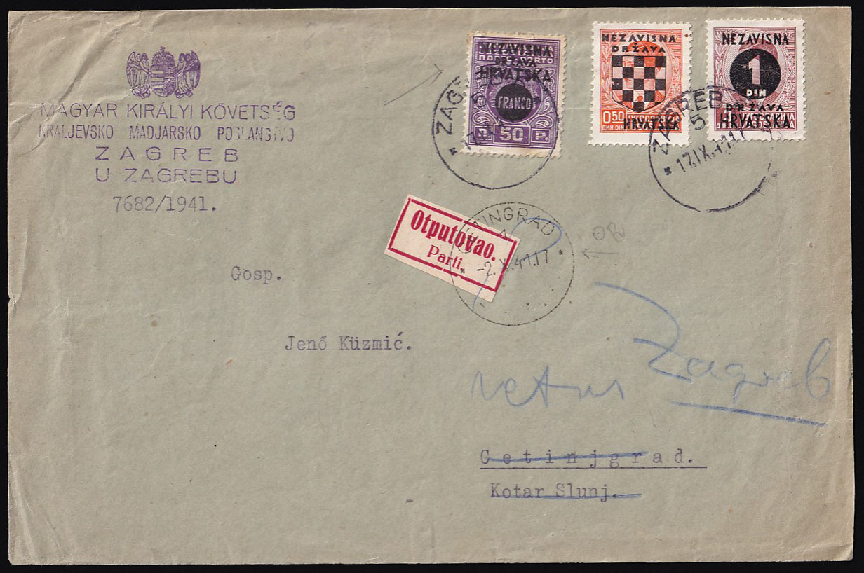 Opis: Pismo upućeno iz Mađarske ambasade u Zagrebu u Cetingrad kod Slunja 17.09. 1941. Točna frankatura s tri različita provizorna izdanja. Dolaz na poleđini. Primatelj otputovao te je pismo vraćeno natrag pošiljatelju. Dobra kvaliteta.