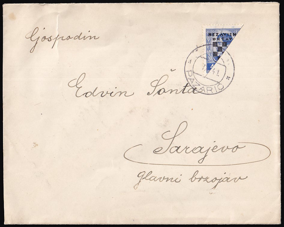 Opis: Pismo upućeno iz Pazarića u Sarajevo 07.10. 1941 godine. Točno frankirano kao međumjesno pismo polovoicom marke od 4 din. Dobra kvaliteta.