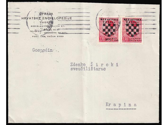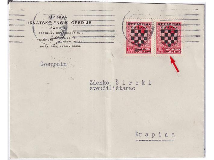 Opis: Pismo upućeno iz Zagreba u Krapinu 29.11. 1941. Frankirano vodoravnim parom maraka 1,5 din koje imaju pogrešku pretiska, djelomični otisak HRVATSKA preko starog naziva države. Vrlo atraktivna i rijetka vjerojatno slučajna pogreška pretiska. Dolaz na poleđini. Dobra kvaliteta.
