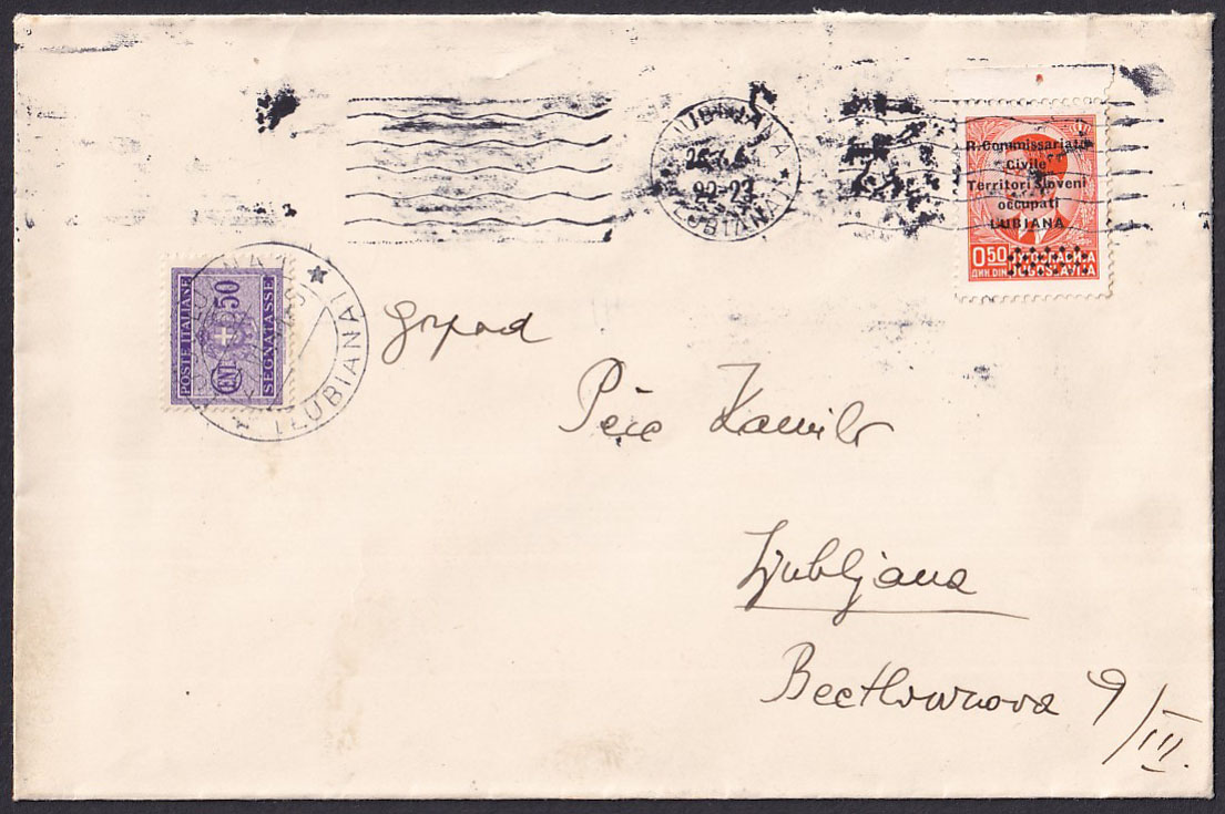 Opis: Pismo upućeno loko Ljubljana 26.06. 1941. Nedovoljno frankirano markom 0,50 din. talijanske okupacije Slovenije. Poništena strojnim žigom Ljubljana i u dolasku portirano talijanskom porto markom 50 centi. Žig ljubljana 27.07. 1941.