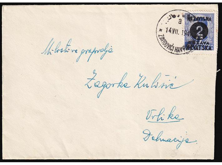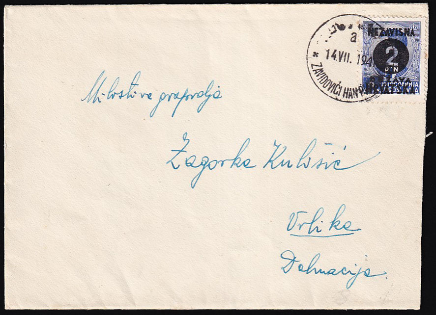 Opis: Pismo upućeno prugom ZAVIDOVIĆ-HAN PIJESAK a u Vrliku 14.07. 1941. Odlična kvaliteta, rijedak željeznički žig.
