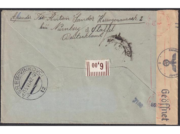 Opis: Pismo upućeno zrakoplovom iz Njemačke u Sarajevo 10.06. 1942. Dolaskom u Zagreb upućeno prugom ZAGREB-VINKOVCI 12 na odredište. Cenzurirano po OKW cenzuri. Trag dolaza na poleđini. Dobra kvaliteta.