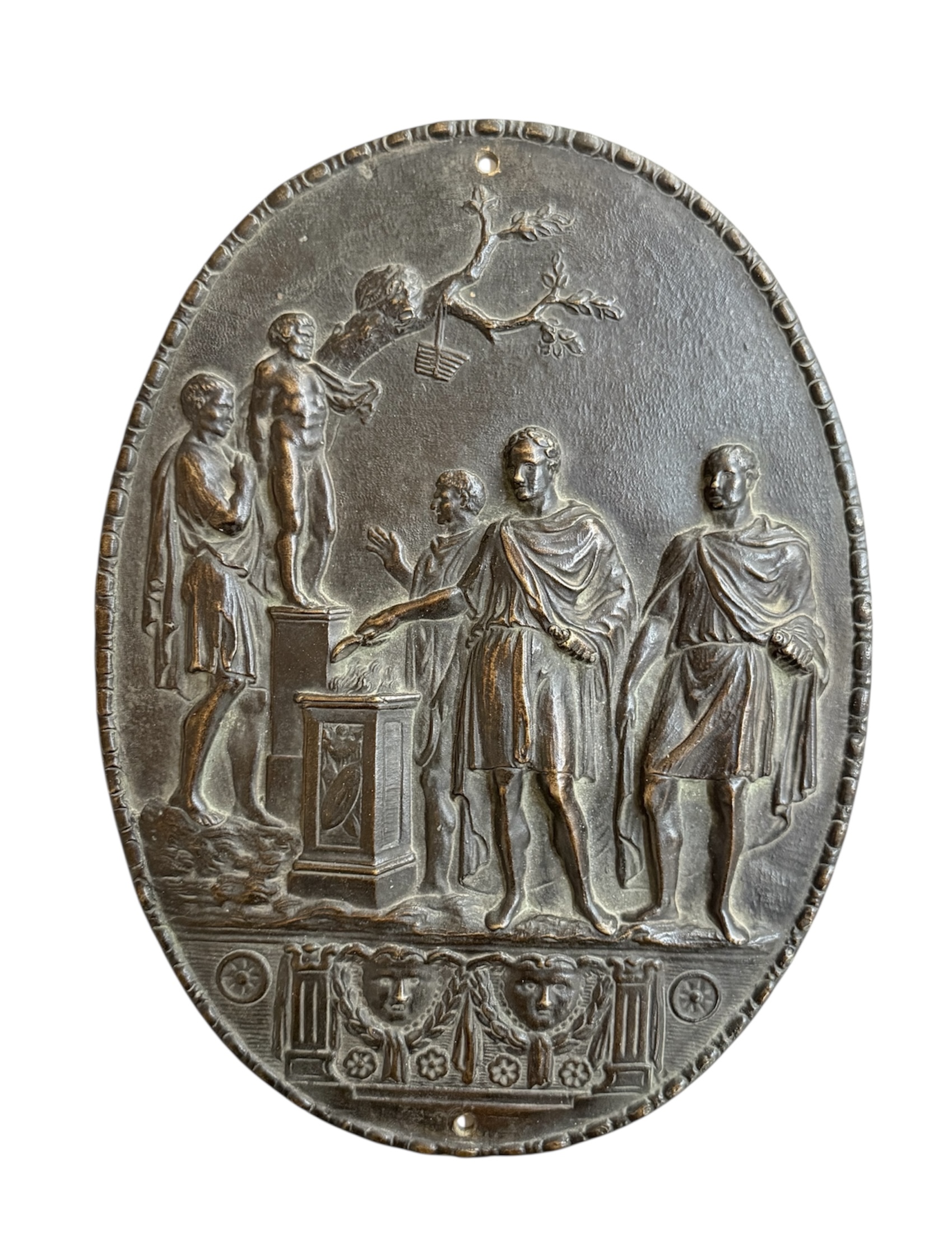 Opis: Plaketa koja predstavlja žrtvovanje Herkulu (kasnije Silvanusu) - prikaz je originalno s Konstantinovog slavoluka u Rimu, AE 200x265 mm, talijanski rad 18. stoljeće, vjerojatno prema Valeriu Belli (1468-1546). Atraktivno i dekorativno.
